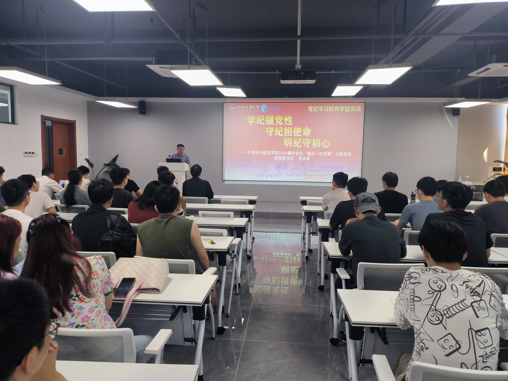 年永琪从组织开展好党纪学习教育的重大意义出发,带领同学们重温习近平总书记关于党的纪律建设的一系列重要讲话精神,系统学习了新修订的《中国共产党纪律处分条例》,要求同学们要进一步严明党的组织纪律,增强遵规守纪的自觉性,将组织纪律内化为日用而不觉的言行准则,切实做到学纪、知纪、明纪、守纪。课上,年永琪还作为师长和朋友,向毕业生党员们提出三点希望:一是希望大家坚定理想信念,把人生第一粒扣子扣“好”;二是希望大家筑牢思想底线,把人生第一粒扣子扣“紧”;三是希望大家练就过硬本领,把人生第一粒扣子扣“实”。不论身处任何位置都要记住工作职责与权力由党和人民赋予,牢固树立红线意识,不放纵私欲,不贪图私利,不违法乱纪,养成正确的廉洁品质,坚守法纪底线。