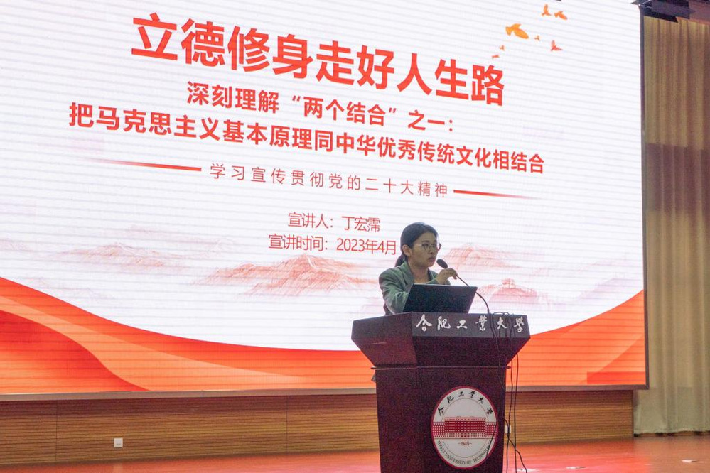 会议最后,公司党的二十大师生宣讲团成员丁宏霈作题为“立德修身走好人生路”的宣讲,围绕科学社会主义价值观,从个人层面、家庭层面、社会层面三个角度,分享如何做好格物致知、诚意正心、修身齐家、治国平天下四个层次,把马克思主义基本原理同中华优秀传统文化相结合,勉励同学们在未来的人生路上传承和弘扬好中华优秀传统文化,为全面建设社会主义现代化强国贡献力量。