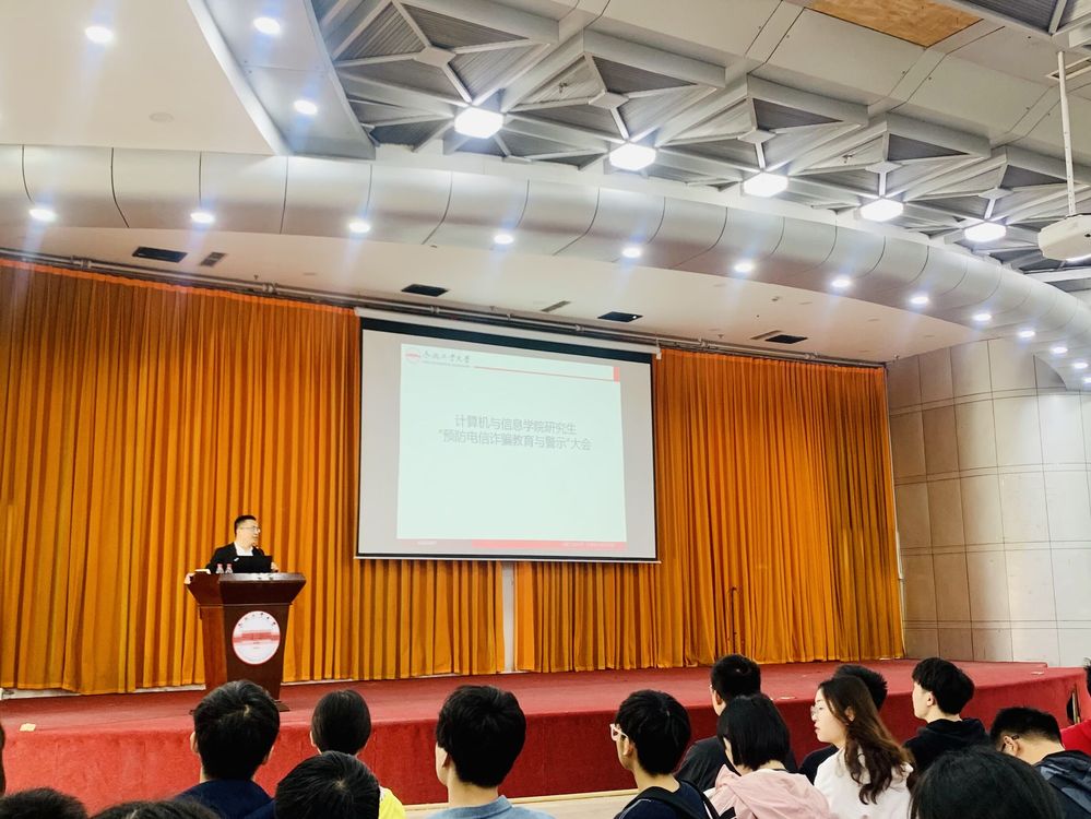 党委保卫部付老师则以近期发生的校园电信诈骗事件为例,结合防诈骗宣传手册,详细介绍了冒充客服注销校园贷、网络贷款诈骗、网络兼职诈骗、网络购物诈骗、网络刷单等多种常见诈骗手段,使同学们对电信诈骗的严重危害性产生更加深刻的认识。推荐同学们下载“国家反诈中心”APP,并嘱咐同学们遇到电信诈骗要沉着冷静,及时向公司保卫部门、老师寻求帮助。