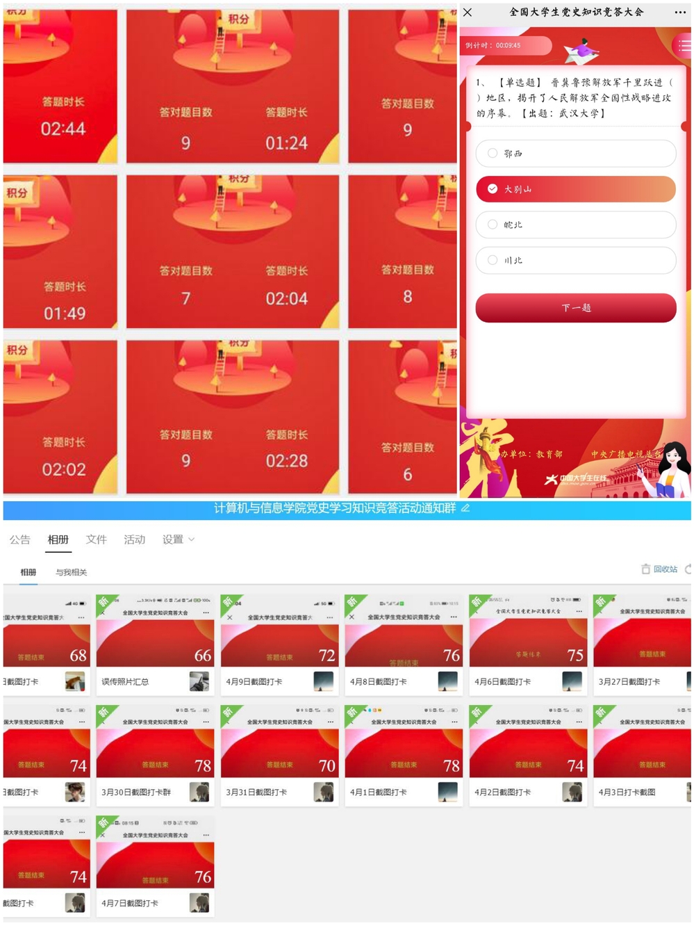 本次知识竞答活动围绕中国共产党百年党史相关内容展开,依托“中国老员工在线”微信公众号中的“党史答题”栏目,通过创建答题QQ群使参与员工通过每日答题、群聊打卡、感悟分享等学习党的历史、传承党的精神。活动期间,同学们坚持每日答题,积极打卡,在相互促进、寓学于乐的氛围中学习党史,增进对党的了解,提升思想觉悟,强化政治素养。群内一张张截图反映出同学们对本次党史知识竞答活动的热情。同学们表示通过参加本次党史知识竞赛活动掌握了更多的党史知识,深刻体悟到了党的初心使命和伟大精神,也激励着自己在今后的学习生活中牢记初心使命,赓续中国共产党人的精神血脉。