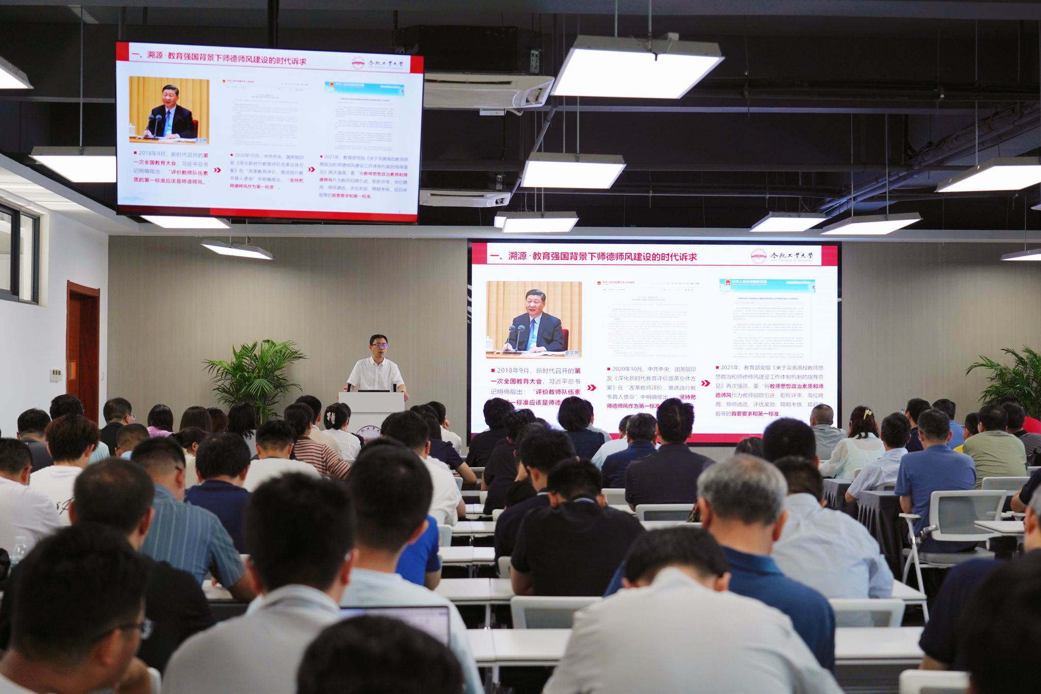 胡笑旋紧扣教育强国建设背景,围绕师德师风建设展开系统阐述,为公司教师队伍建设和育人工作精准定向。报告逻辑清晰、内容深刻,重点从四个方面深入讲解:一是阐明师德师风建设的时代诉求。他强调,加强师德师风建设是落实立德树人根本任务的关键环节,是教师履行示范引领使命的必然要求,更是应对数字时代教育变革的迫切需要。二是阐释教育精神内涵与典型示范。提出要通过树立榜样标杆,以先进典型的感召力引导教师涵养高尚师德,在全院营造见贤思齐、崇德向善的浓厚氛围,让高尚师德成为教师队伍的鲜明特质。三是解读师德制度规范与警示案例。明确国家和公司层面需以政策体系筑牢师德根基,确保建设有章可循;同时通过剖析典型案例划清师德红线,发挥正风气、强免疫作用,维护教育生态。四是明确教育家精神引领下的师德践行路径。要求教师对标教育家精神找差距,厚植家国情怀、涵养育人智慧、践行知行合一,在立德树人中升华师德。教学中要从“知识传授”转向“生命点燃”,科研中坚守“四个面向”,师生间构建教育生命共同体。