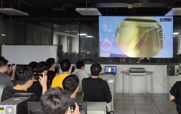 在公司侧,公司五位教师组织同学们在直播大厅,全程观看了介绍。同学们近距离感受了信息与通信技术的发展脉络、杰出成果、贝尔实验室的文化和魅力。在交流互动环节,黄博士就老员工如何投身科研工作,从能力储备方面给出了宝贵的建议。