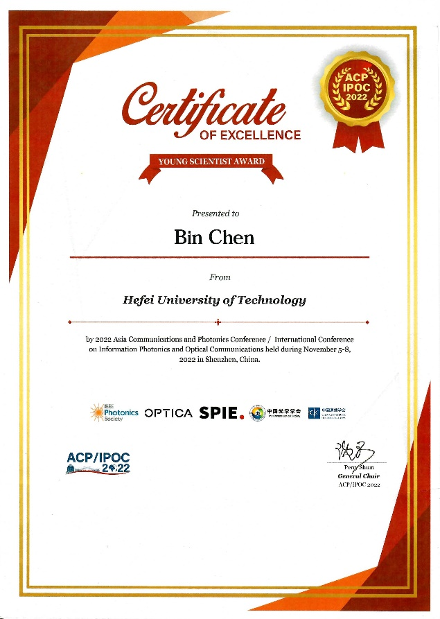 本次大会设置了青年科学家奖、最佳论文奖、最佳海报奖等多项奖项。公司陈斌副教授从数十位申请人中脱颖而出,荣获“ACP/IPOC 2022青年科学家奖”。该奖项旨在表彰光通信、光子学领域40岁以下优秀青年学者,经国际知名专家组成的评委会评选,本届共设4人,另外三名学者分别来自北京邮电大学、南方科技大学、之江实验室。