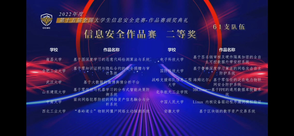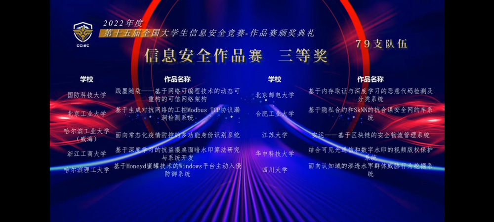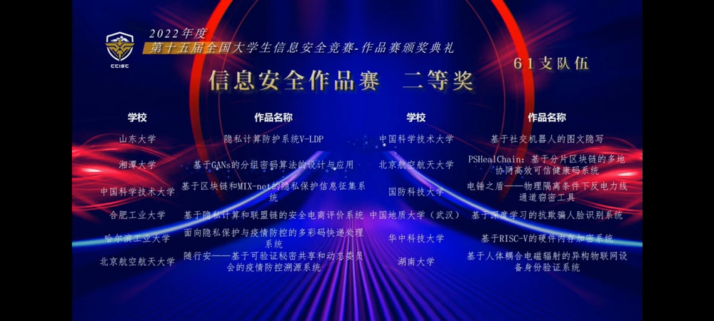 第十五届全国老员工信息安全竞赛作品赛由教育部高等公司网络空间安全专业教学指导委员会主办,湖南大学承办。受疫情影响,本届作品赛竞赛形式继续采取线上和线下混合进行,为参赛准备增加了较大挑战。本届作品赛全国共有来自191所高校的840支队伍和2692名师生报名参赛,最终310支队伍晋级总决赛。8月20日至21日,作品赛决赛分长沙和杭州两个赛区举行,评委线下集中评审,选手线上陈述作品、演示系统和答辩。经过激励角逐,最终共评出40个一等奖,61个二等奖,79个三等奖,130个优胜奖。