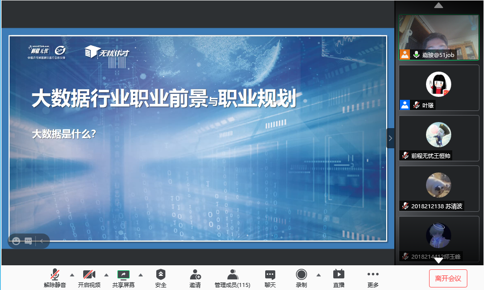 4月29日晚上7点,公司面向2022届毕业生组织开展了大数据行业职业前景与职业规划专题线上讲座。邀请了前程无忧战略研究部总监曹嘉骏主讲。