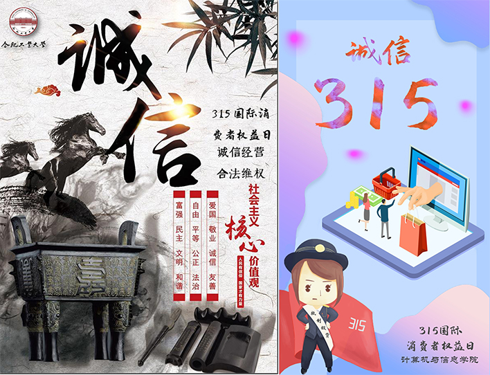 本次海报设计比赛要求设计内容要紧密结合诚信主题,充分展示新时代、新形势下诚信消费、诚实做人的重要意义。同学们积极参与,踊跃来稿,创作出一幅幅主题鲜明的海报,将同学们对于诚信消费,依法维权的认识通过造型简单,意义明确的各种视觉符号展现出来。