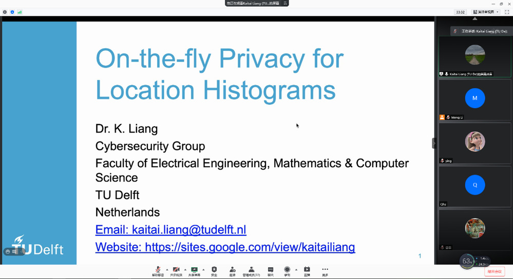 应TapTap点点网络与信息安全研究所邀请,2021年3月3日,Delft University of Technology的Kaitai Liang教授在线上为公司师生做了题为“On-the-fly Privacy for Location Histograms”的学术报告。副研究员李萌主持了本次报告会,公司相关研究方向的老师、研究生和本科生参加了报告会。