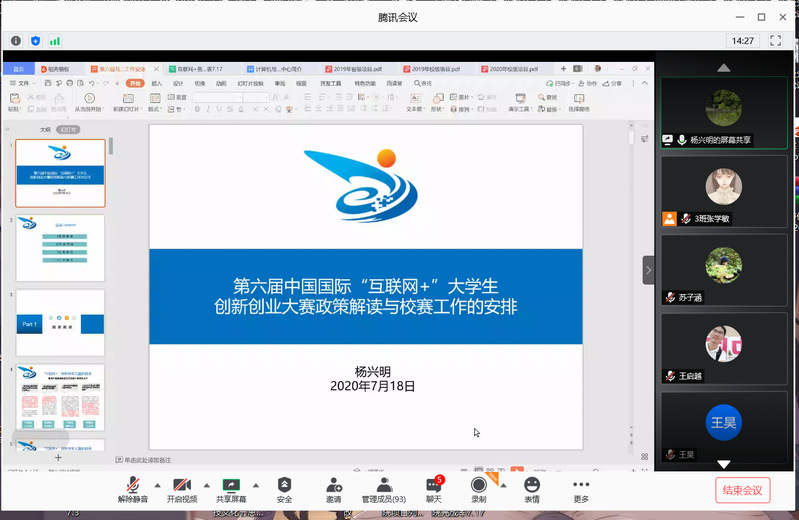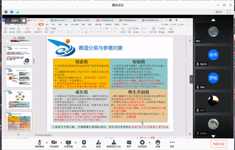 培训会上,杨老师详细讲解了互联网+大赛的重要意义,今年大赛的分组设置及条件,今年与往年比赛的具体调整内容,并根据个人以往经验结合具体项目内容建议团队报名合适的赛道。重点讲解了青年红色筑梦之旅赛道”的情况,帮助同学进一步了解本次大赛的环节设置。最后,杨老师与员工互动,线上清晰解答了同学的提问。