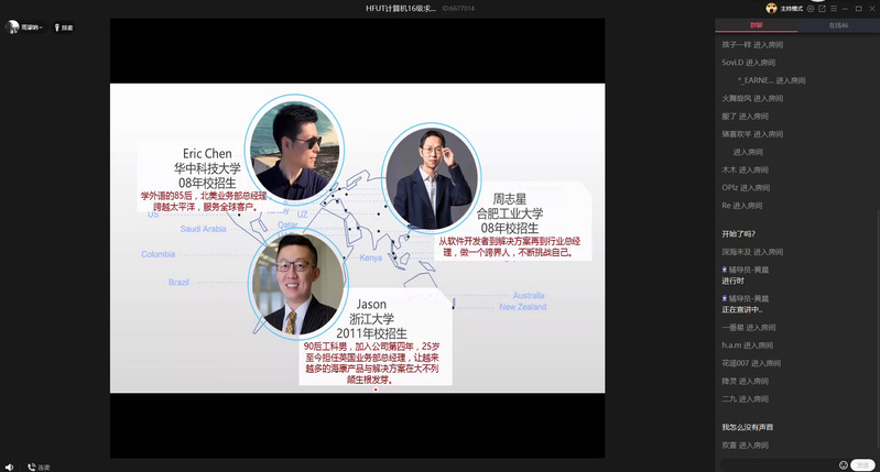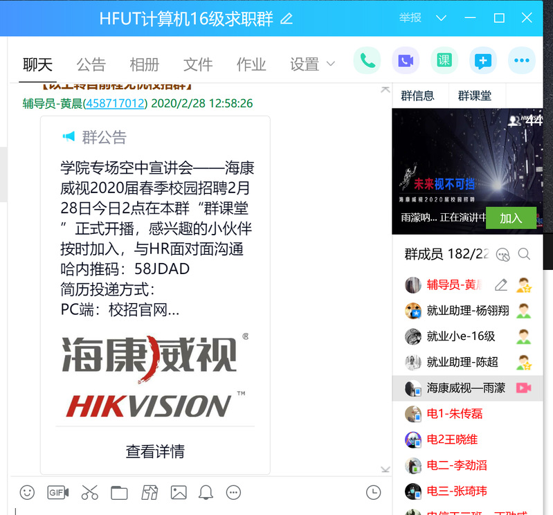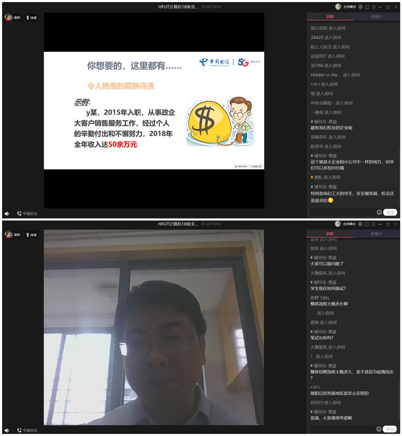 海康威视人事专员陈雨濛、锐捷网络HR林远锋和中国电信安徽分公司招聘负责人袁炜在不同时间段分别进行了持续一小时的线上宣讲,通过直播的方式向公司毕业生介绍本企业的发展历程、文化氛围、岗位需求及优秀员工等,分布在各地的计算机学子在直播间和HR互动、沟通。尤其针对自身关心的问题与宣讲人实时互动:“软件开发都是嵌入式方向的吗?”“公司对应届生有系统的培养路径吗?”,气氛十分热烈。