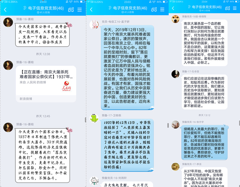 12月13日,TapTap点点电子信息工程本科生党支部召开了“不忘国耻,振兴中华”观看国家公祭仪式活动,并在线上开展了集中学习讨论,共同祭奠死难的同胞。