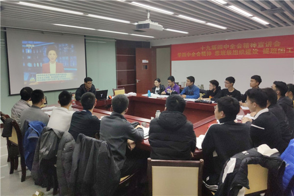 为深入学习宣传贯彻党的十九届四中全会精神,引导广大青年员工明确历史责任与担当,引导员工干部以四中全会精神为指导,深入思考班级组织建设,全面提高班团工作能力,12月21日晚,2019级辅导员刘世国在科教楼A座1106会议室召开了十九届四中全会精神宣讲会,2019级班长及团支书参会学习。