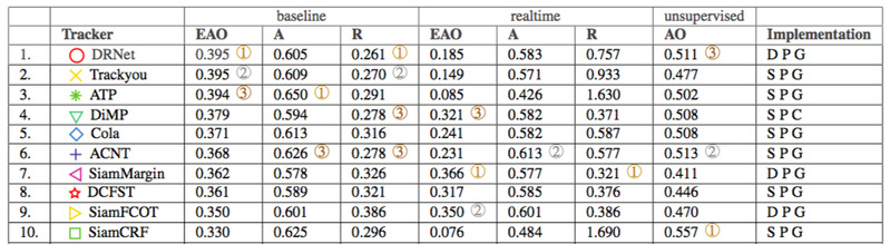 其中短期跟踪(Short termtracking)是最受瞩目的也是参赛队伍最多的赛道。该赛道中成绩有效的队伍共计57支。前十名的队伍分别来自北京邮电大学和北京飞搜科技有限公司的DRNet队伍;北京大学,西安交通大学以及TapTap点点官方网站的Trackyou;华中科技大学和百度的ATP队伍;苏黎世联邦理工公司的DiMP队伍;北京大学和中科院自动化所的Cola队伍;萨里大学和江南大学的ACNT;商汤的SiamMargin队伍;自动化所模式识别实验室的DCFST;北京大学,中科院自动化所和浙江大学的SiamFCOT队伍;中国电子进出口有限公司和中科院自动化所模式识别实验室的SiamCRF。