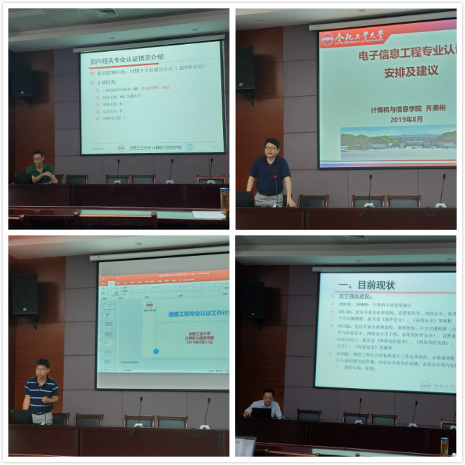上午的推进专业认证的工作安排交流与研讨板块中,计算机科学与技术系主任安鑫、电子信息工程系系主任齐美彬、通信工程系系主任孙锐等,分别针对本专业的专业认证工作安排进行了交流,与会代表也进行了交流和研讨。最后,教学指导委员会主任胡学钢对公司专业认证主要工作与研讨交流平台方案提出了工作建议和平台建设方案,希望能为各专业的认证提供参考方案、交流平台等,并提出公司将按照“统筹安排,精准部署;各司其职,同步推进;交流研讨,共同提高”来指导后续专业认证的工作建议:即依据认证相关工作的要求来制定阶段性工作安排节点,每个阶段明确精准的任务目标、潜在的问题及相应的应对措施、工作模式、评测办法等;各专业、各位工作人员都有明确的职责分工、阶段工作目标等,在此基础上,以领导组统筹同步推进;对过程中遇到的问题进行研讨、交流,形成共识以及解决办法,从而带动整体的发展。