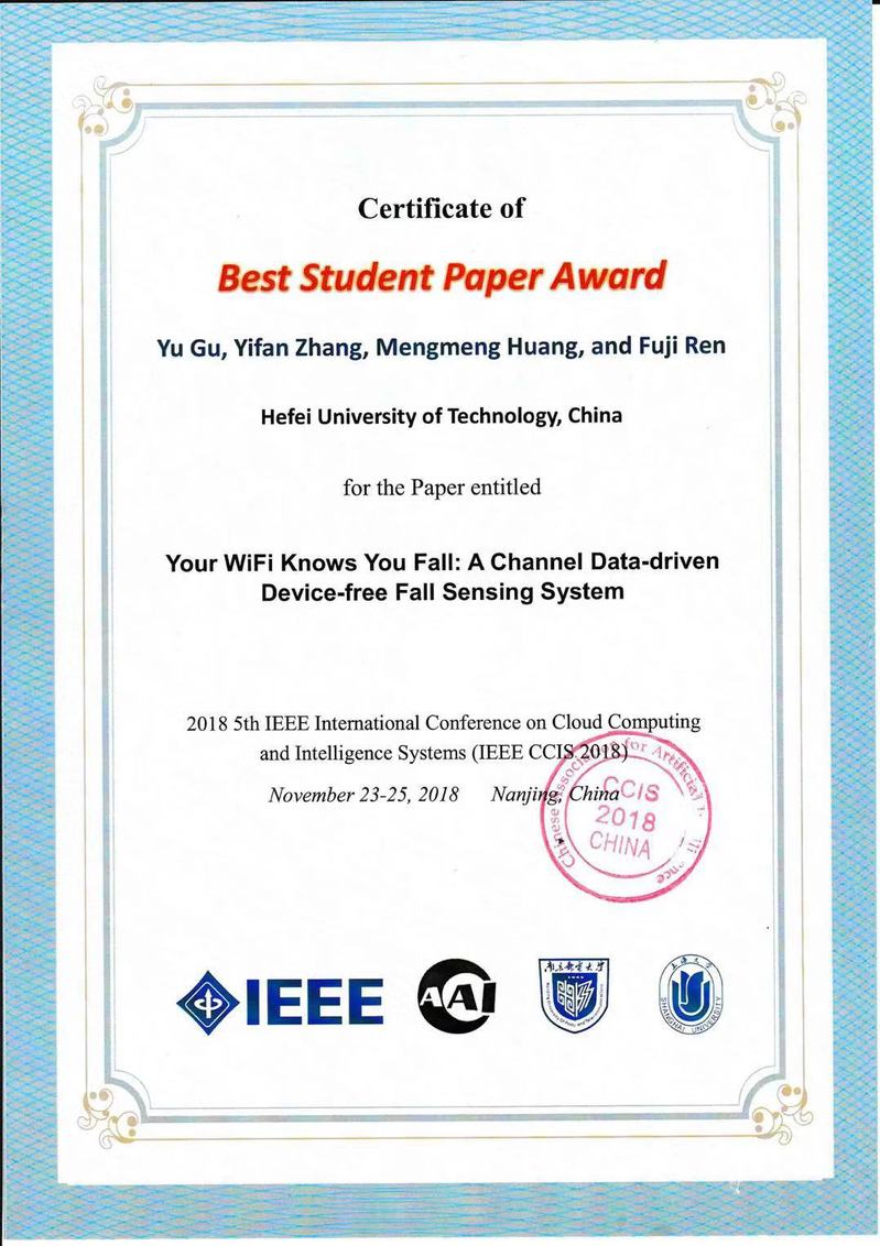 近日,第五届IEEE云计算与智能系统国际会议(IEEE CCIS2018)在南京召开。公司情感计算与先进智能机器安徽省重点实验室谷雨教授指导的研究生张逸凡、黄濛濛撰写的论文《Your WiFi Knows You Fall: A Channel Data-drivenDevice-free Fall Sensing System》从国内外众多论文中脱颖而出,荣获最佳员工论文奖(Best Student Paper Award)。
