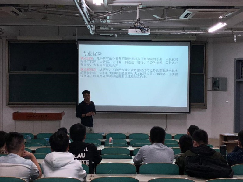 会议开始,刘世国老师结合当前的就业形势和计算机公司就业情况,强调在经济全球化的大背景之下,美国悍然发动贸易战,造成国际就业形势严峻,中国也受到一定影响;今年应届毕业生人数再创历史新高,使得就业形势十分严峻。但同时计算机相关专业的员工具备就业面广的优势,加之互联网公司的巨大吸金能力和对人才的巨大需求,使得计算机相关专业的人才非常抢手,鼓励大家增强信心。