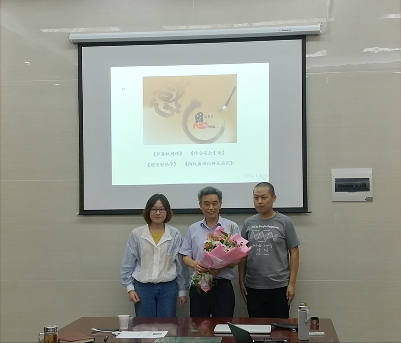 此次欢送会由网络与信息安全研究所所长胡东辉老师主持。胡所长在会上高度赞扬了侯整风教授几十年来在工作岗位上的辛勤奉献,并代表全体研究所的教职工对侯教授的辛勤付出表示感谢。侯教授在会上分享了自己四十多年的教学经历和人生感悟。最后,由信息安全第一届优秀毕业生陈宇副研究员和2015级信息安全专业员工代表黄梦洁为侯教授送上鲜花,表示同学们对侯老师的感谢与由衷的敬意。