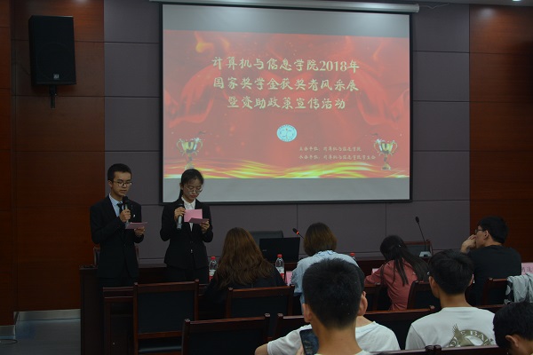 在风采展示环节中,四位国家奖学金获得者在学习方法、竞赛级创新创业项目、大学业余生活分配、个人获奖心得等方面进行了展示分享。其中信安14-1班的阴漫江建议利用各种渠道了解学科、行业的前沿动态;电信工14-2班的周生龙重点讲述了竞赛经历以及动手实践能力的重要性;信安15-1班的黄梦洁强调了要充分利用课堂时间;计科15-3班的王雯云则建议有能力的同学可以尽早进实验室接触项目。随后答疑环节,学长学姐们就所提的 “有哪些获取前沿信息的渠道”、“如何缓解学习压力”、“如何安排奖学金”等问题做了详细的解答,同学们有序提问,虚心学习,现场气氛活跃。2017级辅导员黄凤老师对各类奖、助学金的基本概况进行讲解,同时对同学们进行了鼓励教育并提出了殷切的期望。