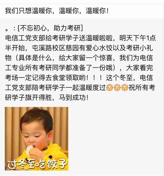 12月22日,党支部成员为考研同学准备了“考研礼包”,贴心准备考研提示和必备的文具用品。冬至当天,在南区慈园食堂煮水饺给备考的考生,祝福考生考试顺利。