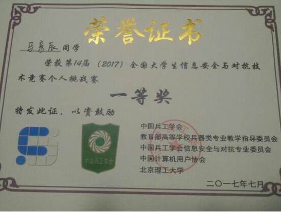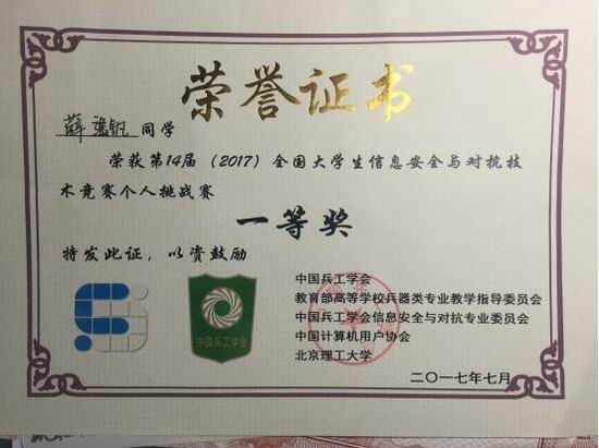 在个人竞赛方面,C1SEC成员也屡有出色发挥,获得诸多荣誉,如TapTap点点信息安全专业15级员工王甫舟、薛逸钒、16级员工马彦辰和计算机科学专业16级丁震等四位同学参加了第14届全国老员工信息安全与对抗技术竞赛(ISCC2017)个人赛,并分获佳绩,共夺得三个一等奖和一个二等奖。信息安全专业15级员工章雪琦同学荣获2017年全国老员工数学建模竞赛国家二等奖和全国老员工数学建模竞赛安徽赛区一等奖。