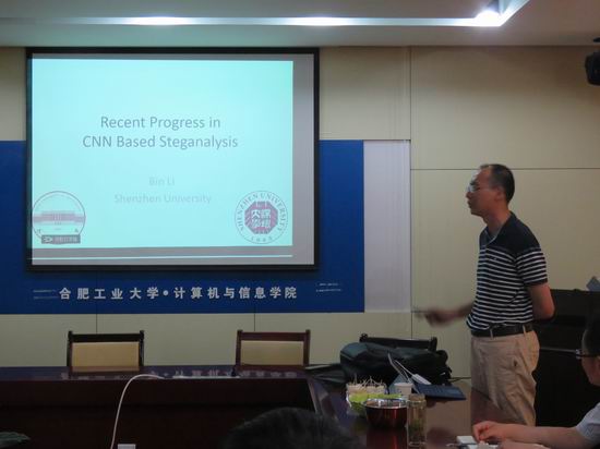 2017年6月2号下午,应计算机公司邀请,深圳大学李斌副教授在公司屯溪路校区逸夫楼408做了题为“Recent Progress in CNN Based on Steganalysis”的学术报告,报告由公司网络与信息安全研究所所长胡东辉副教授主持,公司相关研究方向研究生、部分外校老师参加了本次报告会。
