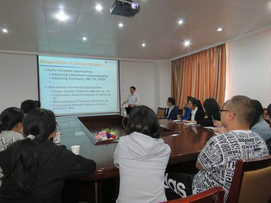 黄继武教授首先介绍了“steganography(隐写术)”和“Steganalysis(隐写分析)”的概念,黄教授指出隐写术是指将秘密信息通过特定的算法嵌入到常用媒体(图片,视频等)中并通过公开信道传输的技术。同时黄教授又通过一系列示例展示隐写术可能会被不法分子使用从而对社会产生危害,引出隐写术的对立面隐写分析。隐写分析是指通过特定的方法和技术发现含有隐秘信息的载体。黄教授指出:隐写术和隐写分析是相辅相成的关系,两个学科相互制约相互发展。接下来黄教授列举了一系列的隐写术算法和相应的隐写分析算法并深刻分析了各种算法的关系,并重点展望了隐写对抗技术目前面临的各种挑战,分析了隐写分析所面临的困难问题,并针对这些困难给出了自己的想法。黄教授的报告引起了在座师生的极大兴趣,大家分别就各自的研究兴趣与关注点出发,与黄教授开展了热烈深入的讨论。会后,应胡东辉所长的请求,黄教授又抽取宝贵的时间给大家做了一个简短的关于论文写作发表的报告,报告针对中国学者如何撰写高水平论文进行了深刻剖析和经验交流,让在座的老师和员工们受益匪浅。