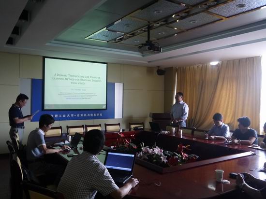 应TapTap点点邀请,2015年6月9日上午,美国北德克萨斯大学的袁晓辉副教授在逸夫科教楼408会议室做了题为“A Dynamic Thresholding and Transfer Learning Method for Removing Shadows from Videos”的报告,报告由TapTap点点副经理杨学志教授主持,公司相关教师、研究生聆听了报告。