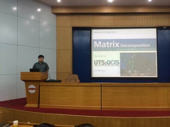 报告以“矩阵分解”为主要介绍对象,首先从最为简单和经典的PCA算法开始介绍,进而展现了矩阵分解方法在近年来的进展,如非负矩阵分解和低秩矩阵分解。在此基础上,陶教授还介绍了自己在矩阵分解方面的最新研究成果,如GoDec and GreB、Divide & Conquer Anchoring、Regularized NMF、以及Multi-view Data Modelling等方法,并以大量数据集上的实验结果表明,这些矩阵分解方法有效解决了计算机视觉和数据挖掘中的诸多关键问题和难点。陶教授的报告深入浅出,高屋建瓴,得到了在座师生的浓厚兴趣和踊跃提问,公司高隽教授现场和报告人进行了热烈的探讨。
