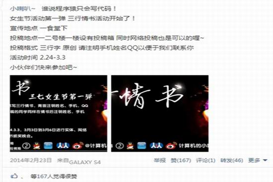 本次女生节共分为“笔墨之痕诉相思”三行情书、“倚此漆墨润相思”定制明信片、“于此一隅待归人”心愿达成和“E路相伴•爱在工大”游园会四个部分。其中三行情书、明信片定制、心愿达成活动得到了全校同学的广泛参与,大家纷纷以优秀的作品,诚挚的明信片,美好的心愿实现表达对女生的尊重,充分体现出工科学子的人文与浪漫情怀。本次活动开设网络在线参与模式,重视各环节的活动成果展示,取得了良好的活动宣传与在线互动效应。三七游园会特邀请外国语公司和电子科学与应用物理公司的女生们共同参与,采用货币共通制度,由公司各班级承办的特色节目与现场游戏供在场观众欣赏游玩,同时倾情奉献公司师生们对广大女生的节日祝福视频,寓教于乐,增强大家的发散思维与综合能力,游园会在一片热闹欢呼声中圆满落幕。