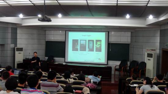 2013年6月14日下午4:00-5:00,谷歌公司美国加州总部研究员郑彦涛博士在斛兵楼报告厅做了题为“世界范围内的地标识别”的学术报告。报告会由公司党委书记蒋建国教授主持。郑彦涛博士的报告主要介绍了谷歌公司在移动设备上进行图像目标搜索和识别的核心技术--世界范围内的地标识别引擎。报告主要分两个部分 (1)如何建立地标物视觉模型: 介绍了谷歌公司的局部特征提取算法,以及如何从互联网上挖掘地标相关的图像数据。(2)在大数据背景下如何保证搜索的高效性:主要介绍了如何采用Map Reduce技术和KD-Tree算法,保证搜索的实时性。报告内容引起了参会师生的浓厚兴趣。报告会后,参会师生分别就自己感兴趣的问题与郑博士进行了交流互动。