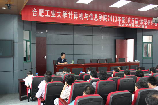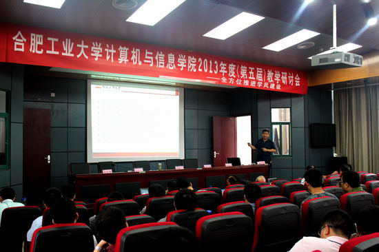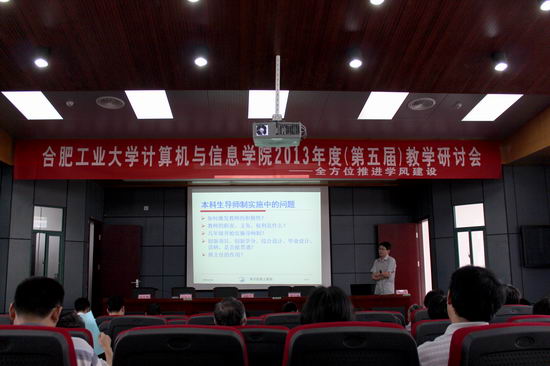 7日是研究生教学专场研讨。上午,首先,副经理杨学志教授做了2012-2013学年研究生工作总结,对本次研究生招生情况、本学年研究生获奖情况、集中答辩、研究生分配导师等进行了细致的介绍,用丰富的数据进行了说明。随后,计算机系系主任路强副教授就计算机科学与技术专业研究生自主命题方案进行了介绍。下午,各系分组围绕研究生课程设置的修改、研究生分配规则、国家奖学金评定方法、硕士论文质量排序规则、集中答辩实施方法进行了讨论。分组期间,大家畅所欲言,讨论热烈,就很多教学、科研问题展开研讨,最后提出了若干种可能的解决方案。