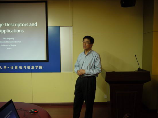 2013年5月31日下午2:30-5:00,公司计算机77级员工、加拿大里贾那大学计算机科学系杨学东教授在逸夫楼408会议室做了题为“Local Image Descriptors and Its Applications”的学术报告。报告会由经理刘晓平教授主持,公司党委书记蒋建国教授、齐美彬教授、詹曙副教授等师生参加了此次学术报告。杨学东教授报告内容分为两个部分:(1)关于局部图像描述子的研究历史及最新进展:介绍了Harris 角点、SIFT、PCA-SIFT等局部描述子的原理及其在图像匹配中的应用;(2)局部描述子在人脸识别中的应用:介绍了杨教授团队将局部描述子与Hough 变换相结合用于人脸识别的优势及实验结果。杨教授的报告深入浅出,报告内容引起了在座师生的浓厚兴趣。报告会后,参会师生分别就自己感兴趣的问题与杨教授进行了交流互动。