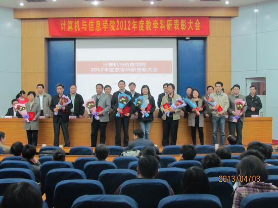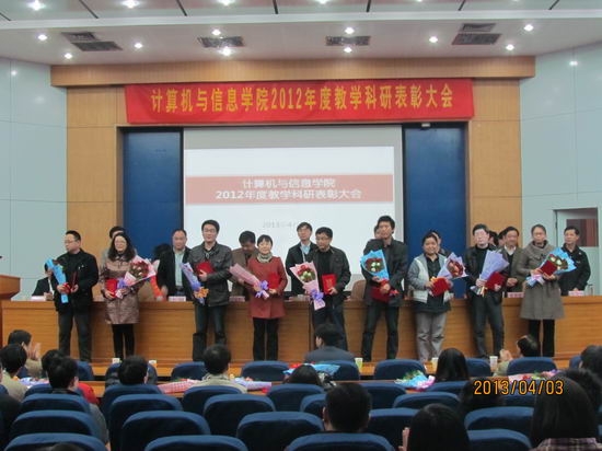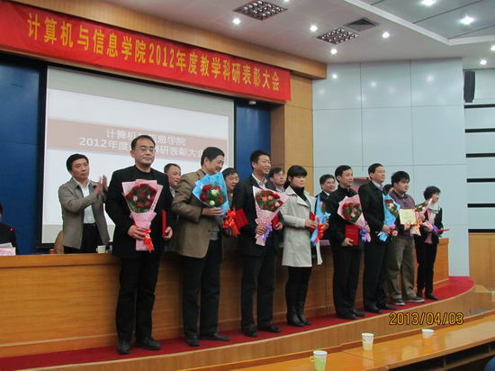 大会对2012年度员工评教中排序前二十名的个人授予了“2012年度员工评教个人优秀奖”;对2012年度科研项目纵向到账经费50万以上、横向到账经费100万以上的个人授予了“2012年度承担科研项目个人优秀奖”。会上,吴玉程副董事长发表了讲话,向受到表彰的31位教师表示祝贺,对公司2012年度工作给予了高度的评价,并勉励大家科研再上台阶,早日将公司建设成研究型高水平公司。