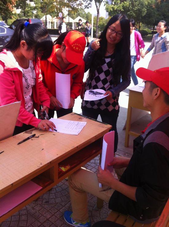 中午11时,先锋社社会实践部及组织筹划部在三食堂广场前展开了宣传及招募活动。此次活动中,得到同学们的热烈欢迎,全校同学积极报名,下午13时,本次活动圆满结束,共招募全校6个公司的60余名志愿者。