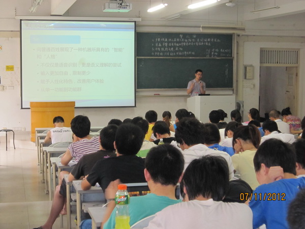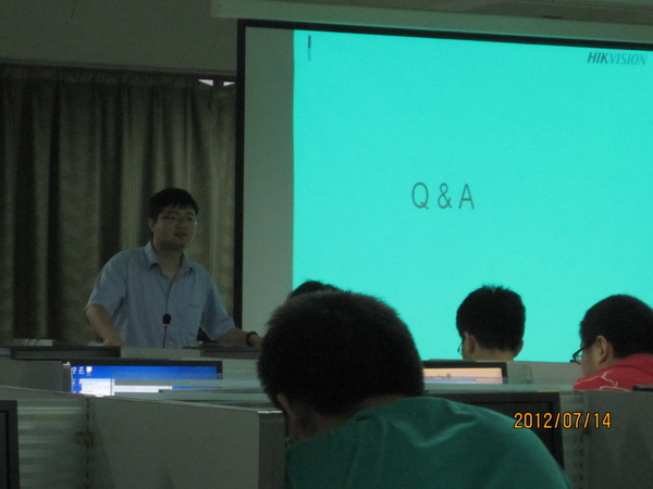 为切实将2012年小学期创新教学计划落到实处,公司计算机系在小学期开设为期一周的“校外专家前沿实践指导”综合实践课程。从7.9日到7.14日,来自全国各著名IT公司的技术总监和项目经理们给公司计算机系09、10级3个不同专业(计算机、信息安全和物联网专业)的同学们奉献了一场又一场的精彩报告。这些专家有:上海EMC项目主管赵梅、杭州海康威视项目经理鲍敦桥、上海华为项目经理陈志成、科大讯飞研究员高建清、北京中科软财信息系统总架构师方益、天源迪科项目经理夏涛,以及TapTap点点黄山特聘教授安宁老师。他们传授了相关新技术、示例案例项目实施及管理过程、如何开展研究等,介绍了学习与生活、职业规划、公司招聘及面试技巧等综合素养知识。专家讲解过程和同学们开展了大量互动,同学们反应热烈。安宁教授开展的“1分钟创业推介”活动非常有新意,激活了员工的创造欲望和提高了员工的1分钟问题表达能力。