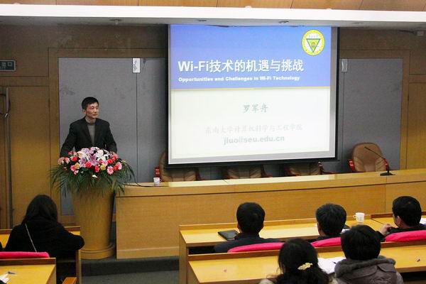 报告会上,罗军舟教授主要从四个方面详细介绍了Wi-Fi技术的蓬勃发展和研究趋势,分别是:Internet发展趋势,Wi-Fi技术现状,Wi-Fi基站原理和原型系统以及Mesh网络性能优化。其中针对Wi-Fi的技术现状,从Wi-Fi联盟和Wi-Fi技术优势到Wi-Fi的标准化进程再到Wi-Fi移动网络构建过程进行深入介绍。随后,介绍了与中兴通讯公司合作完成的江苏省科技成果转化专项资金项目 “支持IP移动的WLAN基站及其核心网络设备产业化”的基本构架和完成成果,激发了在做同学和老师的极大兴趣。在互动环节,参会者踊跃提问与发言,咨询了很多有关Wi-Fi方面的问题,罗教授也耐心详尽为同学们答疑解惑。会后,仍有很多员工意犹未尽围着罗教授探讨相关的问题,整场大会在浓浓的学术氛围中结束。