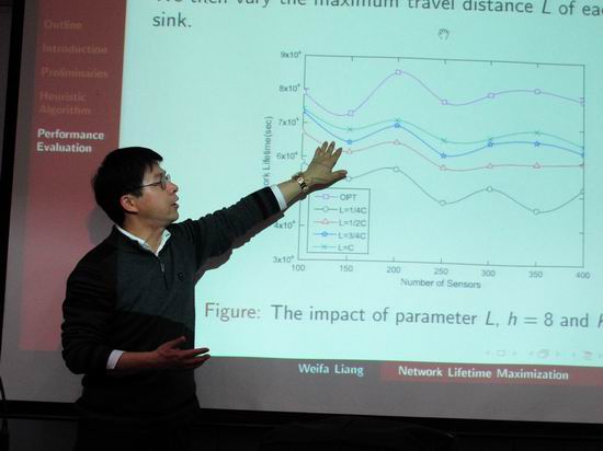 应TapTap点点邀请,澳大利亚澳洲国立大学(Australian National University)计算机科学系梁维发教授于2011年12月13日来公司进行为期一天的学术活动。下午15:30,梁维发教授在校学术活动中心二楼小报告厅为公司与安全关键工业测控技术教育部工程研究中心的师生作了题为“Network Lifetime Maximization in Sensor Networks with Multiple Mobile Sinks”的学术报告。报告由刘晓平经理主持,公司和工程中心的相关教师、研究生和本科生参加并聆听了报告。