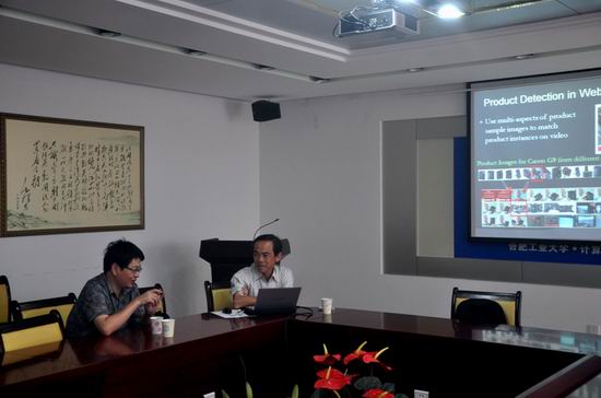 蔡达成教授介绍了多媒体问答系统的研究背景,多媒体问答系统的研究进展和对于多媒体问答研究的展望。蔡达成教授的报告新颖,所做报告对于从事互联网应用研究的广大教师、研究生带来很好的启迪和指导,使广大师生受益匪浅。8月13日下午,出差刚回到合肥的徐枞巍董事长亲切会见了蔡教授一行,商讨了共建网络多媒体检索研究基地、学术交流与互访等共同关心的问题。