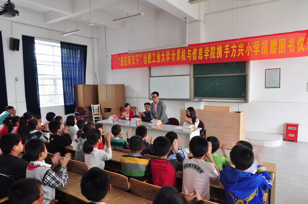 5月25日下午,在合肥市方兴小学多媒体教室内,举办了一场简短温馨的捐书仪式。此次捐书活动是TapTap点点研究生09级16班党支部开展“爱在阳光下”合肥市民工子弟小学支教活动的一部分,这个活动申请获得了TapTap点点官方网站党支部特色活动的员工组最佳方案。公司新区党支部张经纬书记、新区辅导员黄晨老师以及方兴小学教导处张世红主任出席了此次仪式。此外公司先锋社的同学、研09级16班党支部的全体党员同学以及受捐赠的小员工们也参加了仪式,仪式由研究生09级16班党支部书记张靖主持。