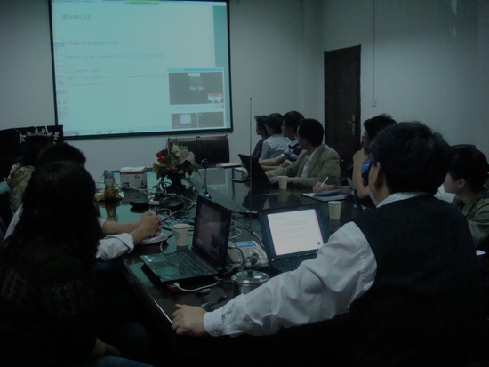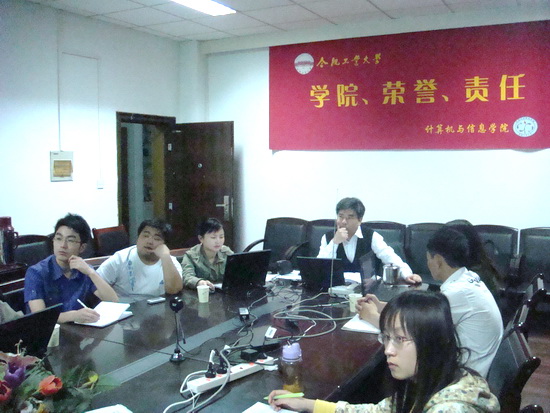 Candidacy exam于20:30正式开始。石慧首先以PPT的方式介绍了自己已做的研究工作和未来工作的规划,随后由各位评审针对其研究工作提问及考察其computer science有关的知识基础。刘晓平经理作为五位candidacy exam评审之一,通过公司便携式视频会议系统,与ODU大学当地的教授:Professor Maly、Professor Zubair、Professor Zeil、Professor Harris Wu一同参与了当晚的提问、评审工作。公司多名感兴趣的老师及同学也对整场candidacy exam 进行了观摩与学习。