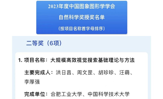 12月1日,中国图象图形学学会公布了2023年度中国图象图形学学会科学技术奖的评选结果。公司洪日昌教授、胡珍珍副教授、汪萌教授及中国科学技术大学的周文罡教授、李厚强教授共同完成的“大规模高效视觉搜索基础理论与方法”荣获中国图象图形学学会自然科学奖二等奖。