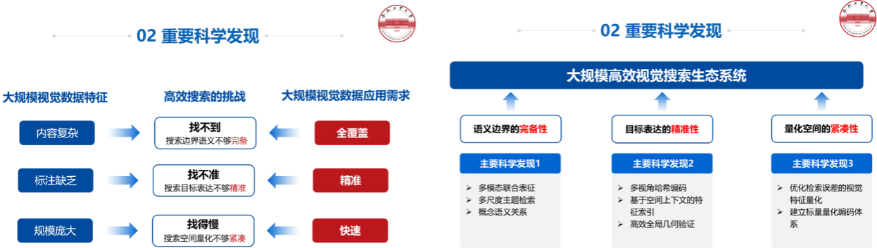 大规模高效视觉搜索理论与方法旨在提升视觉数据资源的获取和分析利用能力,能充分发掘视觉数据资源的支撑潜力,带动技术研发体系创新。要实现对互联网上所需图像的快速且精准的查找,需要实现对互联网视觉数据对搜索边界的完备化构建,对搜索目标的精准化表征以及对搜索空间的紧凑性表达,建立完整的视觉搜索生态系统。在国家自然科学基金杰出青年科学基金、优秀青年科学基金和面上项目的资助下,该成果立足于面向大规模高效视觉搜索下的特征表达,为实现搜索边界的完备化,搜索目标的精准化和搜索空间的紧凑化三个目标,展开了深入研究,提出了相应的理论和方法,取得了一系列具有创新性的研究成果。项目成果获得了多位中/美/欧/澳等国院士及ACM/IEEE/IAPR Fellow的正面评价和高度认可,研究成果有力推动了本领域及相关领域的发展。