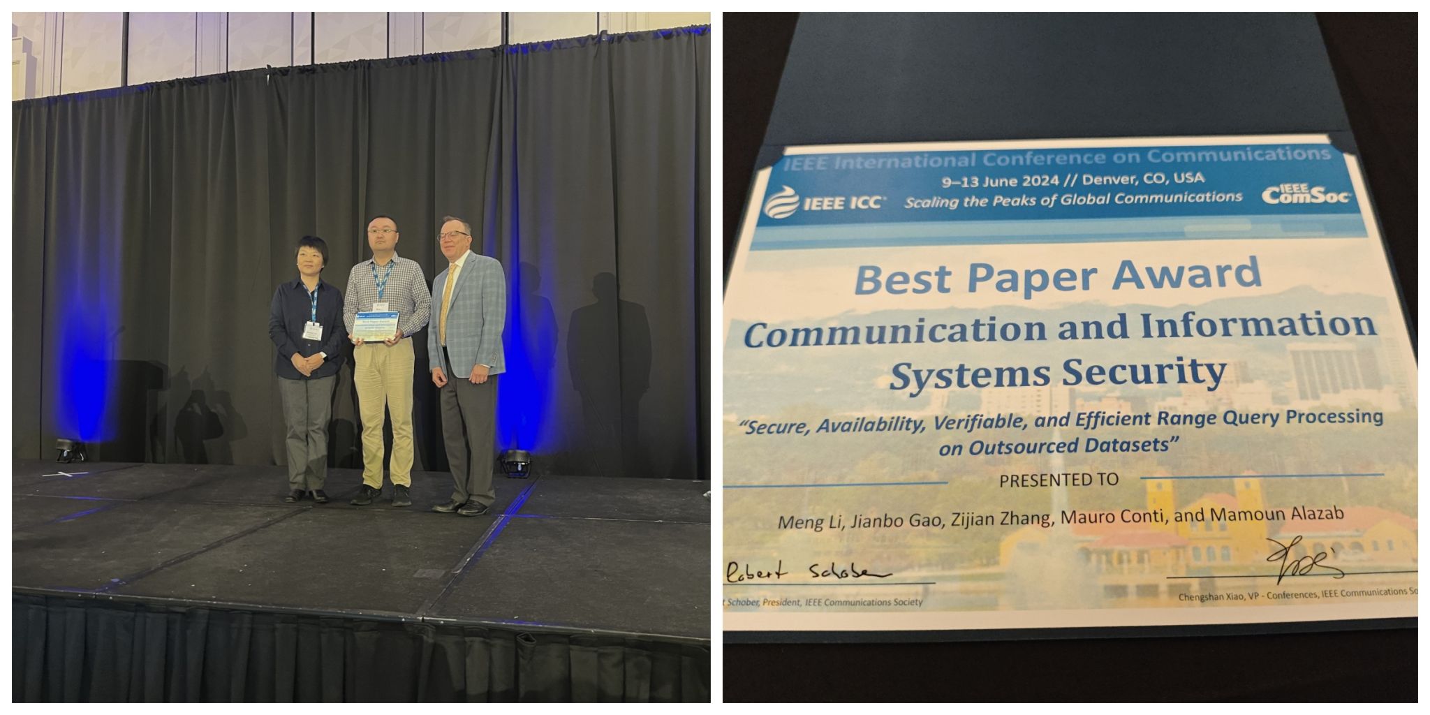近日,通信领域旗舰会议IEEE International Conference on Communications (IEEE ICC) 2024在美国召开,公司副研究员李萌课题组的研究成果“Secure, Availability, Verifiable, and Efficient Range Query Processing on Outsourced Datasets”在众多论文中脱颖而出,获得了本次大会最佳论文奖,这也是本次大会通信和信息系统安全分会唯一获奖论文。第二作者是公司2023届硕士毕业生高剑博,当前正于北京理工大学网络空间安全公司继续攻读博士学位。该论文聚焦于安全范围查询的结果可验证问题。范围查询允许数据用户将其数据外包给云服务器,该服务器响应提交具有范围条件的请求的数据用户。然而,安全问题阻碍了其广泛运用。现有的工作忽视查询项目的可用性,未能提供安全验证保护或为了效率而牺牲搜索准确性。该研究提出安全、可用、可验证和高效范围查询方案(SAVE),具有三个显著的特点:针对恶意云服务器的安全可用性检查,设计了一个基于密钥索引和安全验证机制来检查匹配节点可用性的方案,包括有效性和新鲜度检验;为查询结果的正确性和完整性,在不影响安全性的条件下设计了一种有针对性的验证机制;设计了一种分层编码方法来提高搜索效率和准确性。该研究形式化地陈述并证明了SAVE在随机预言机模型中的安全性,并在多个数据集上进行了广泛的实验来验证效率。