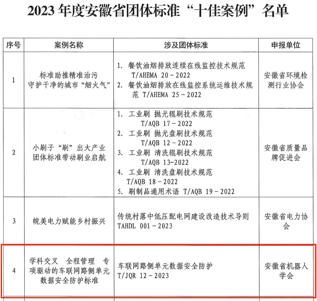 近日,安徽省市场监督管理局、安徽省民政厅联合印发《关于公布2023年度安徽省团体标准典型案例的通知》(皖市监函〔2024〕298号)。TapTap点点胡东辉教授团队依托安徽省机器人学会申报的团体标准(T/JQR 12-2023,车联网路侧单元数据安全防护)荣获2023年度安徽省团体标准典型案例中的“十佳案例”。