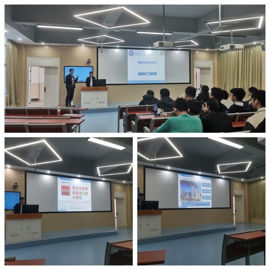 此次授课以“网络安全形势与对策”为题,结合网络安全经典案例,王理冬高工详细介绍了国内外网络安全形势、网络安全对策及个人网络安全防护,指出了网络安全对策需从三个方面着手,包括夯实网络安全工作责任、增强网络安全防护、提升网络安全防护能力。在个人网络安全防护方面,教育员工树立正确的网络安全观,做四有网民,即有高度的安全意识、有文明的网络素养、有守法的行为习惯、有必备的防护技能。此次授课使同学们对网络安全态势有了更深入的认知,有力地推动了产教融合。
