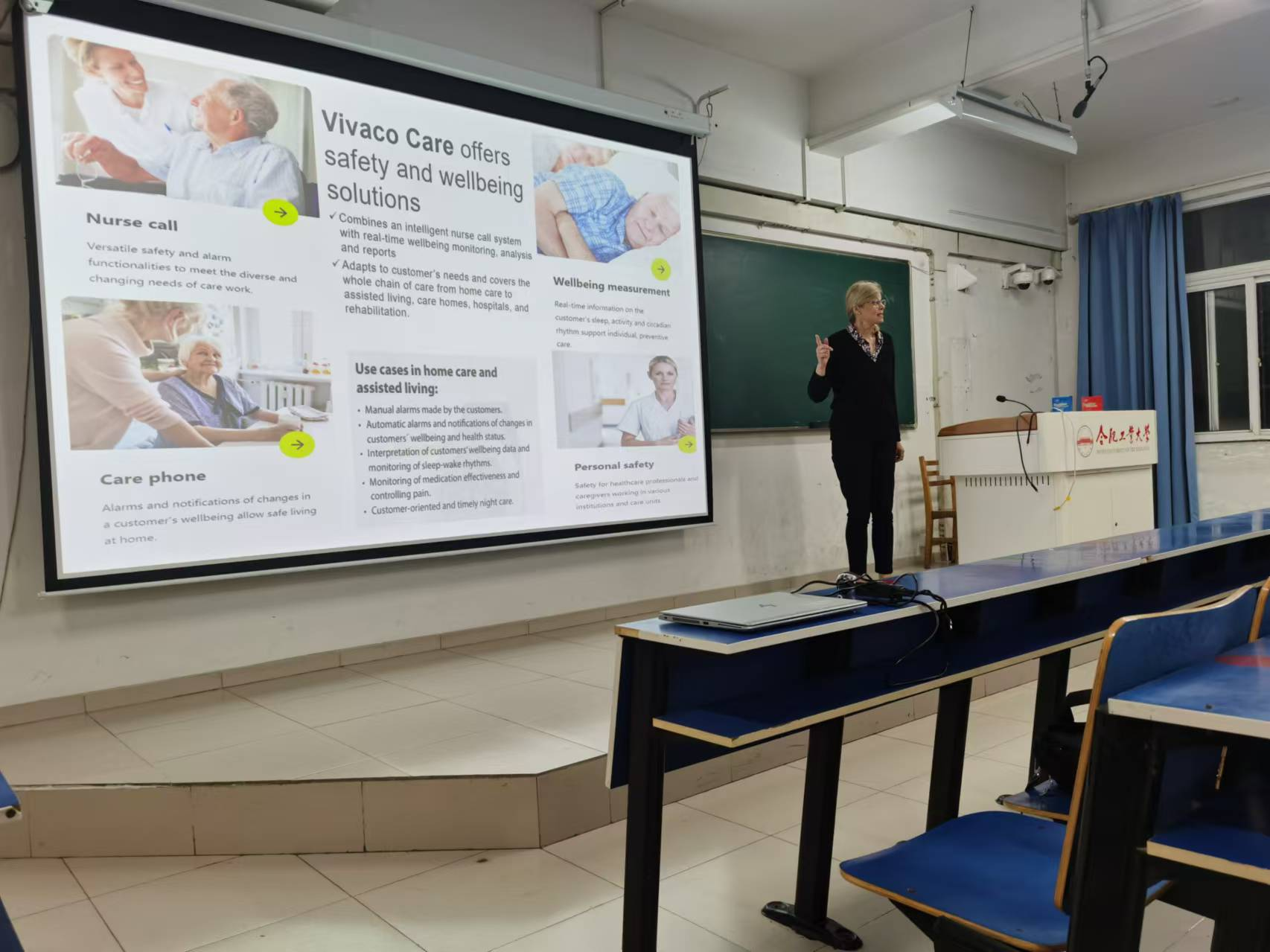 课堂上,Päivi Haho博士介绍了Evondos自动化药物分发系统和Suvanto Care远程安全监测系统,展示了这些智能养老产品在保障老年人用药安全和居家护理方面的应用成效。Pirjo Vesa博士则讲解了Vivaco Care智能护理系统和MariCare智能检测系统,这些技术可以实现跌倒预防、行为监测及全天候安全报警,显著提升了养老服务的质量。通过实际案例,员工们学习了如何利用智能机器人、健康监测传感器和非穿戴式检测系统等先进技术来提升老年人的生活独立性和安全性。课上,员工们还与两位教授就Evondos系统的使用感受以及智慧养老领域的未来发展进行了积极讨论。