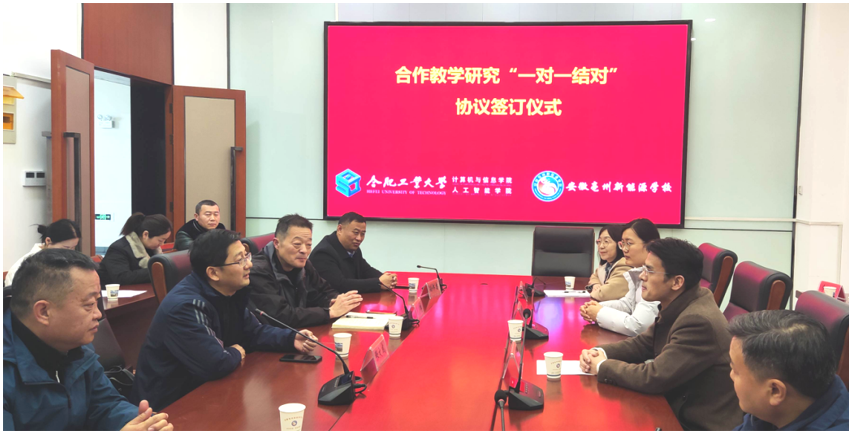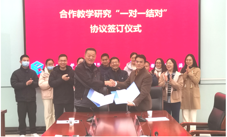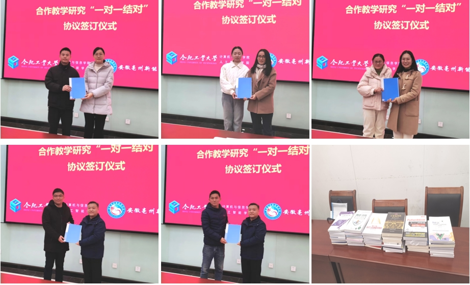 随后,公司与新能源公司进行了合作教学研究“一对一结对”签约仪式。现场,双方公司的5对教师“牵手”成功(图3),他们将在接下来的6个月里,合作开展教学、科学研究,形成一定的研究成果,并进行成果的合作发表,另外,我方教师还将协助对方进行学历提升的各项准备工作,包括考研的复习和备考。仪式最后,还进行了计算机类优秀图书的捐赠。