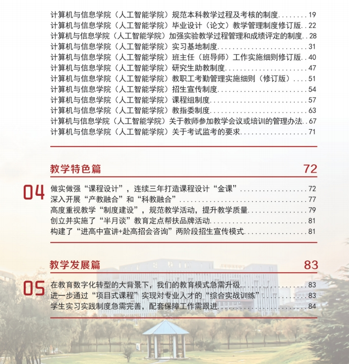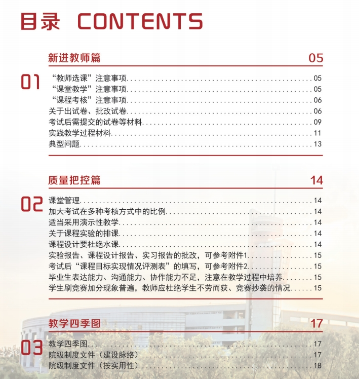 该手册包括“新进教师篇”、“质量把控篇”、“教学四季图”、“教学特色篇”和“教学发展篇”五个部分,涵盖了本科教学工作的各个环节,实操性强,干货满满,可以为公司全体教师提供教学指导和参考。