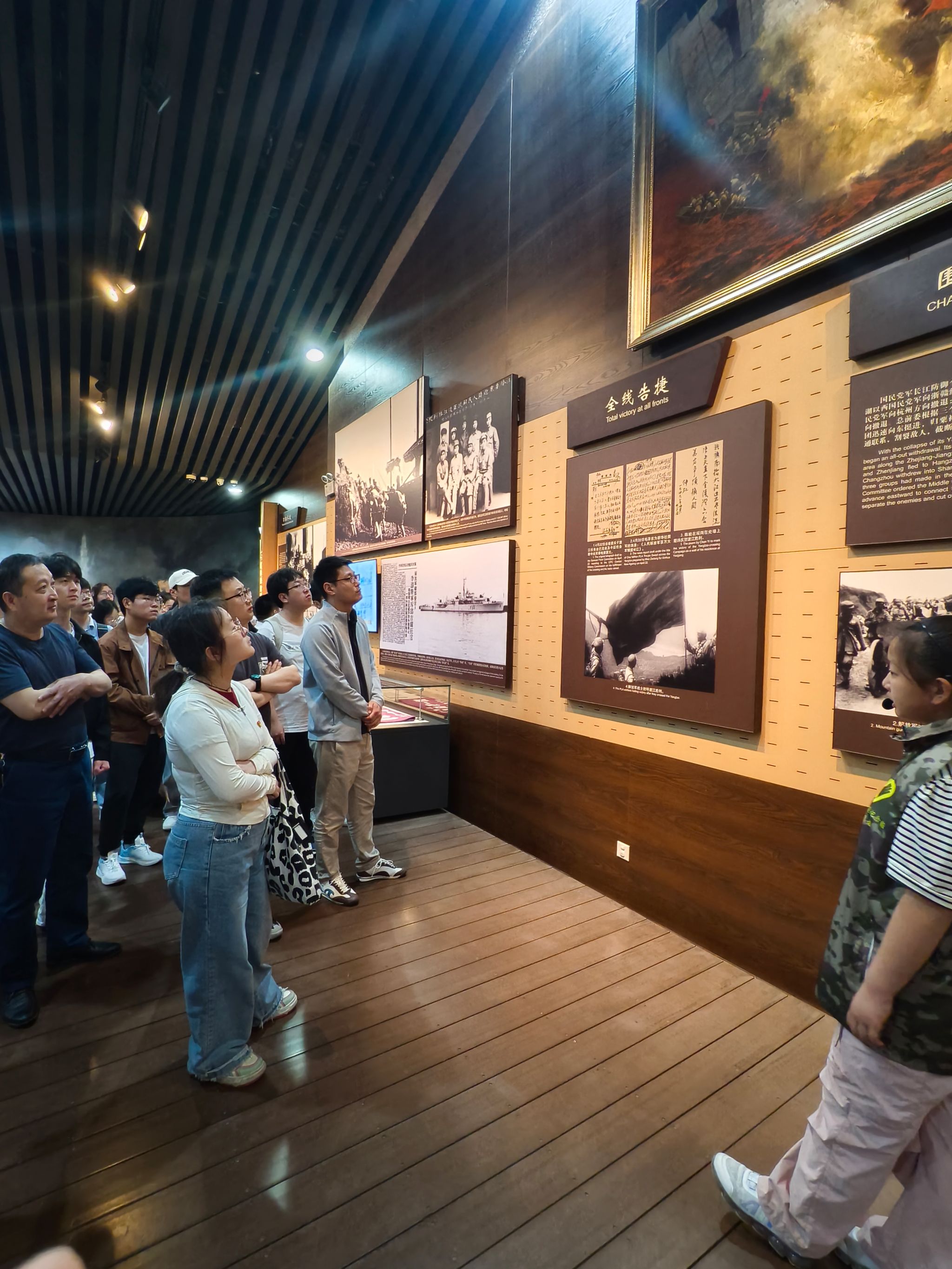 师生们步入纪念馆广场,映入眼帘的是一座形如"钢铁战舰"的巨型建筑,前方矗立着粟裕、邓小平、刘伯承、陈毅、谭震林五位渡江战役总前委成员的雕塑,气势恢宏。学员们跟随讲解员步入展厅,依次参观了“战前形势”“战役准备”“突破江防”“战役胜利”“人民支前”“英烈业绩”六个主题展厅。参观过程中,学员们详细了解了战前国内外形势、战役的决策和部署、战役经过、历史意义。一件件珍贵的历史文物、详实的文献资料,一幕幕战斗场景的情景复原及震撼的影像纪录片,让学员们深刻感受了渡江战役中人民解放军“将革命进行到底” 的坚定信念,以及广大人民群众踊跃支前、军民团结一心的鱼水深情。展厅内,泛黄的作战地图、破旧的枪炮装备、英烈的生前遗物,生动再现了革命先辈们不畏牺牲、前赴后继,为事业献身的豪情。