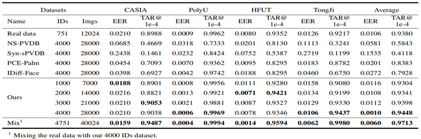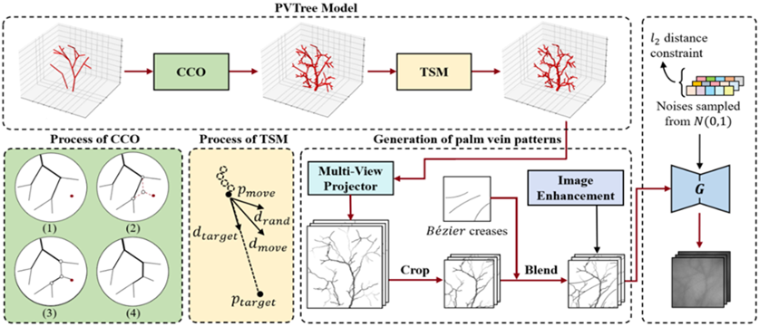 Abstract: Palm vein recognition is an emerging biometric technology that offers enhanced security and privacy. However, acquiring sufficient palm vein data for training deep learning-based recognition models is challenging due to the high costs of data collection and privacy protection constraints. This has led to a growing interest in generating pseudo-palm vein data using generative models. Existing methods, however, often produce unrealistic palm vein patterns or struggle with controlling identity and style attributes. To address these issues, we propose a novel palm vein generation framework named PVTree. First, the palm vein identity is defined by a complex and authentic 3D palm vascular tree, created using an improved Constrained Constructive Optimization (CCO) algorithm. Second, palm vein patterns of the same identity are generated by projecting the same 3D vascular tree into 2D images from different views and converting them into realistic images using a generative model. As a result, PVTree satisfies the need for both identity consistency and intra-class diversity. Extensive experiments conducted on several publicly available datasets demonstrate that our proposed palm vein generation method surpasses existing methods and achieves a higher T AR@F AR = 1e − 4 under the 1:1 Open-set protocol. To the best of our knowledge, this is the first time that the performance of a recognition model trained on synthetic palm vein data exceeds that of the recognition model trained on real data, which indicates that palm vein image generation research has a promising future.